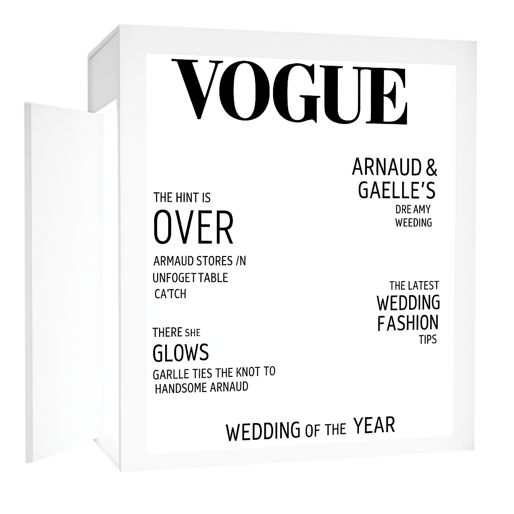 Styled like an iconic Vogue front page, it adds a dash of red-carpet glamour to your celebration while keeping a sleek, contemporary edge. The compact frame slides effortlessly into any venue—chapel foyer, garden marquee, or ballroom—without stealing space from the dance floor. Inside, up to four guests can pose together, so the newly-weds, bridal party, and doting relatives all get their cover-star moment.